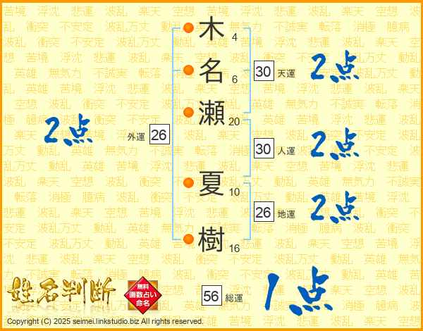 木名瀬夏樹さんの天運は30画の2点!