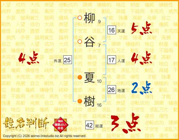 柳(9画)谷(7画) 夏(10画)樹(16画)