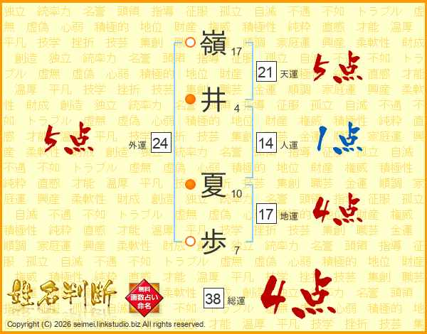 嶺(17画)井(4画) 夏(10画)歩(7画)