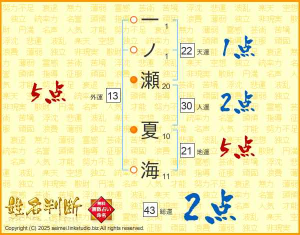 一(1画)ノ(1画)瀬(20画) 夏(10画)海(11画)