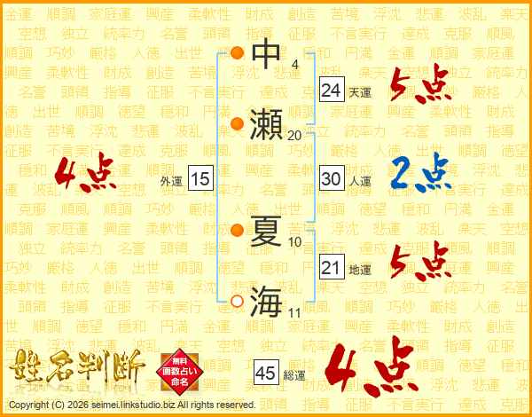 中(4画)瀬(20画) 夏(10画)海(11画)