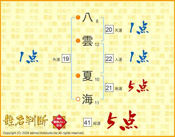 八雲夏海さんの総運は41画の5点!