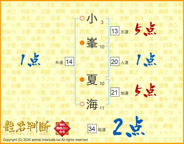 小(3画)峯(10画) 夏(10画)海(11画)