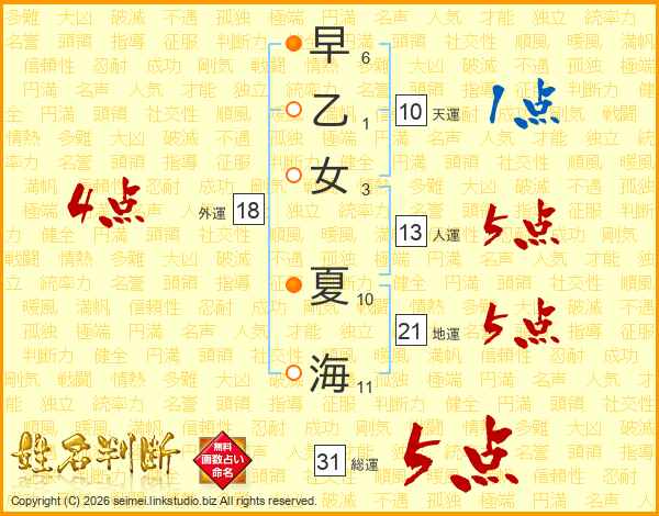 早乙女夏海さんの総運は31画の5点!