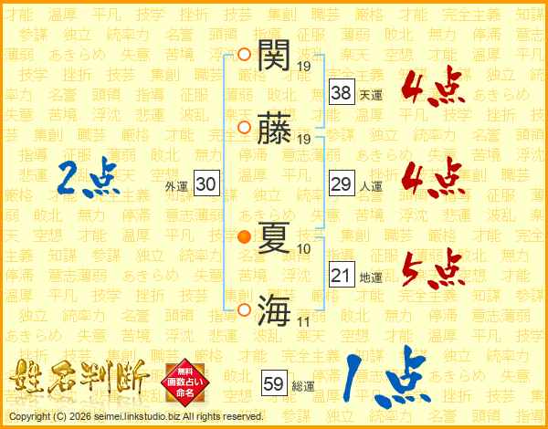 関(19画)藤(19画) 夏(10画)海(11画)