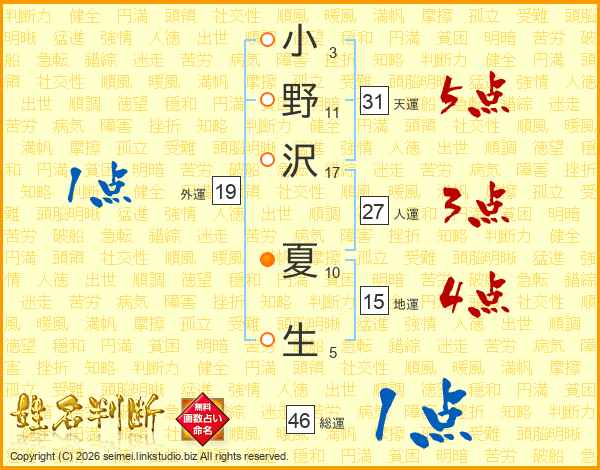 小野沢夏生さんの総運は46画の1点!