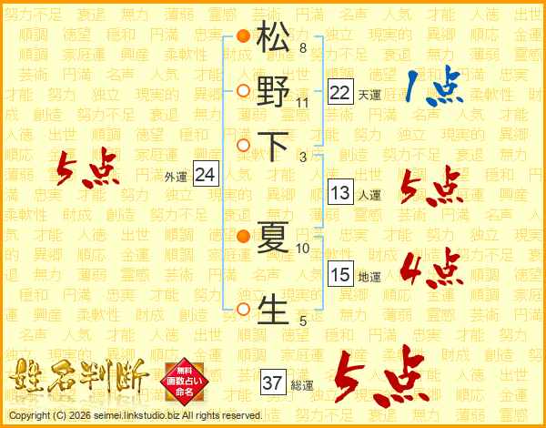 松(8画)野(11画)下(3画) 夏(10画)生(5画)