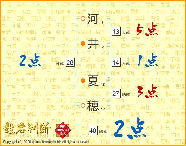 生活面を象徴する運勢です。外部から受ける影響力を表し、結婚運、家庭運や職場、環境への順応性を表します。総運から人運を引いた画数。姓や名が1文字の場合を除く。