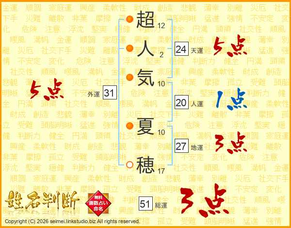 超(12画)人(2画)気(10画) 夏(10画)穂(17画)