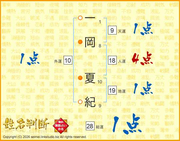 一(1画)岡(8画) 夏(10画)紀(9画)