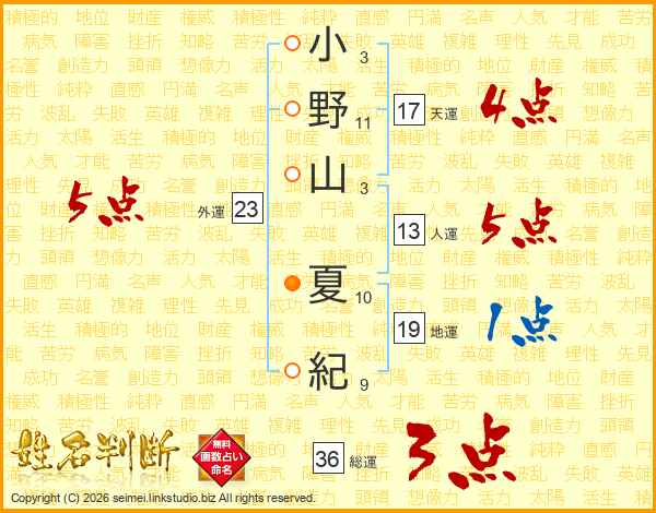 小(3画)野(11画)山(3画) 夏(10画)紀(9画)