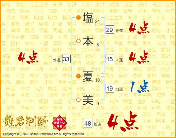 生活面を象徴する運勢です。外部から受ける影響力を表し、結婚運、家庭運や職場、環境への順応性を表します。総運から人運を引いた画数。姓や名が1文字の場合を除く。