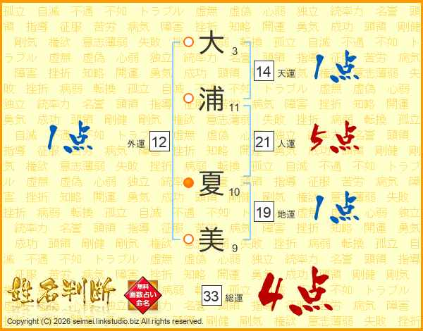 大浦夏美さんの総運は33画の4点!