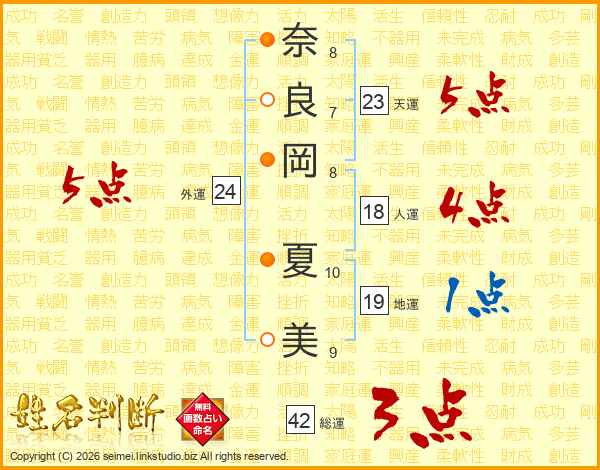 奈(8画)良(7画)岡(8画) 夏(10画)美(9画)