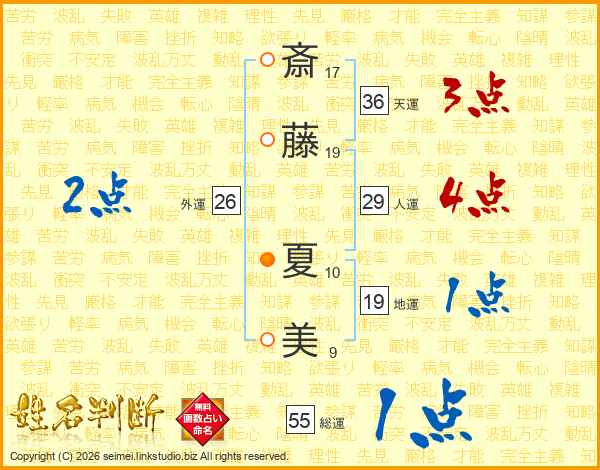 斎(17画)藤(19画) 夏(10画)美(9画)
