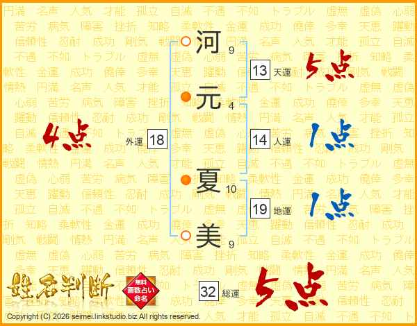 生活面を象徴する運勢です。外部から受ける影響力を表し、結婚運、家庭運や職場、環境への順応性を表します。総運から人運を引いた画数。姓や名が1文字の場合を除く。