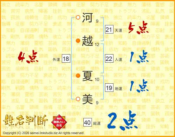 生活面を象徴する運勢です。外部から受ける影響力を表し、結婚運、家庭運や職場、環境への順応性を表します。総運から人運を引いた画数。姓や名が1文字の場合を除く。