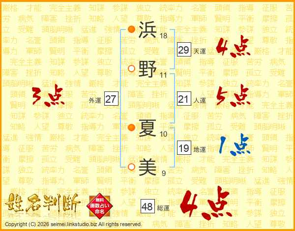 あなたの人生を表す1番重要な運勢です。生涯を通じて影響する総合運となり、主に50歳以降の晩年期に影響を及ぼします。苗字と名前の合計画数。