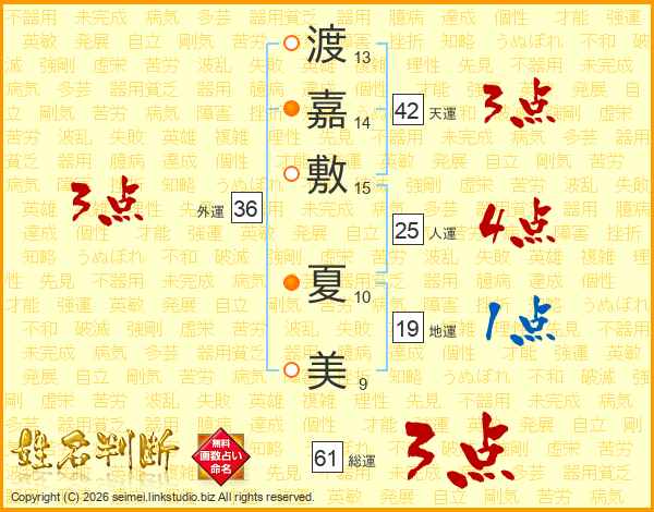 渡(13画)嘉(14画)敷(15画) 夏(10画)美(9画)