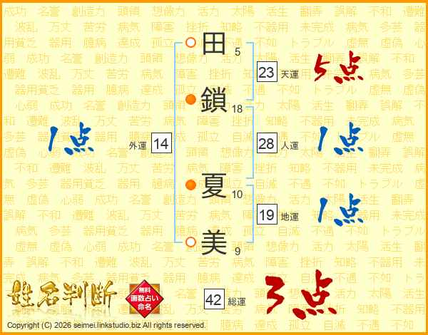 田(5画)鎖(18画) 夏(10画)美(9画)