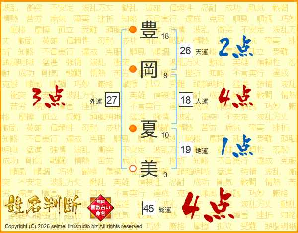 豊(18画)岡(8画) 夏(10画)美(9画)