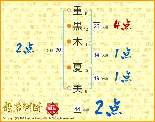 重(9画)黒(12画)木(4画) 夏(10画)美(9画)