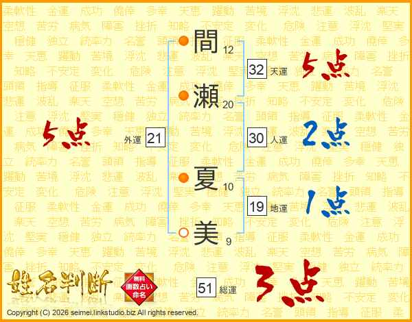 間(12画)瀬(20画) 夏(10画)美(9画)