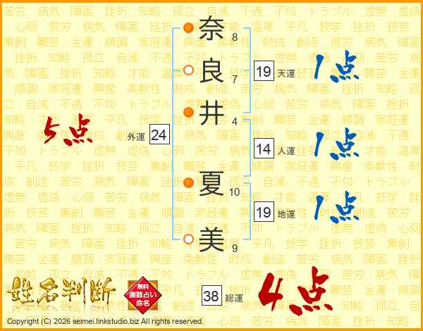 奈(8画)良(7画)井(4画) 夏(10画)美(9画)