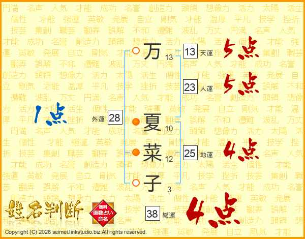 生活面を象徴する運勢です。外部から受ける影響力を表し、結婚運、家庭運や職場、環境への順応性を表します。総運から人運を引いた画数。姓や名が1文字の場合を除く。