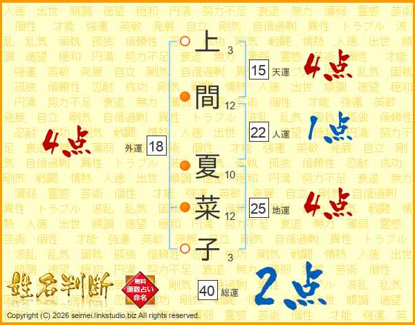 上(3画)間(12画) 夏(10画)菜(12画)子(3画)