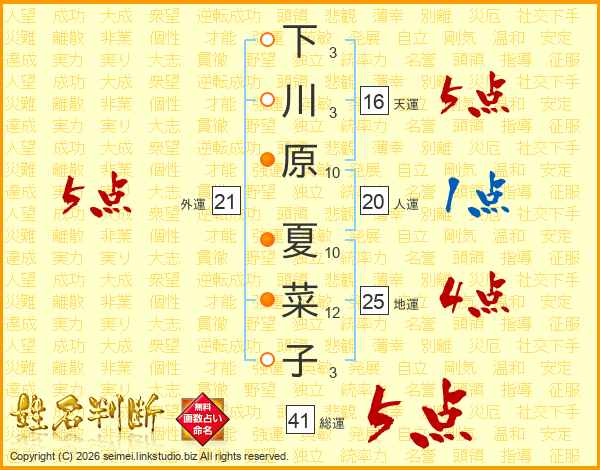 下(3画)川(3画)原(10画) 夏(10画)菜(12画)子(3画)