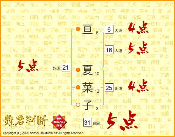 亘夏菜子さんの総運は31画の5点!