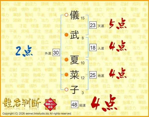 儀(15画)武(8画) 夏(10画)菜(12画)子(3画)