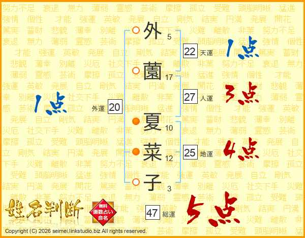 外(5画)薗(17画) 夏(10画)菜(12画)子(3画)