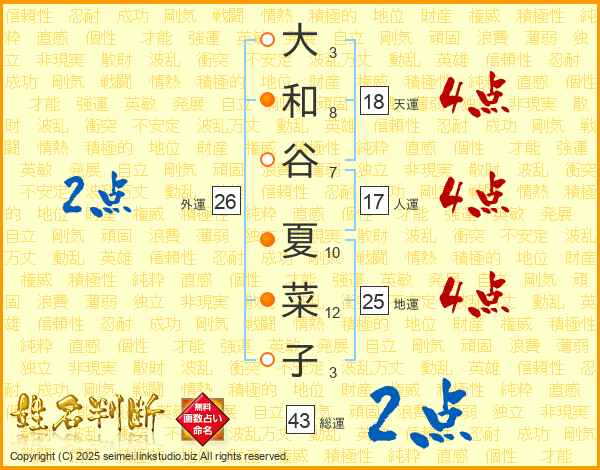 大和谷夏菜子さんの総運は43画の2点!