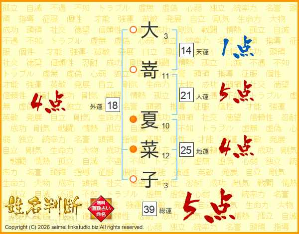 大(3画)嵜(11画) 夏(10画)菜(12画)子(3画)