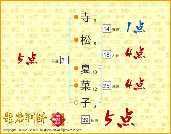 寺(6画)松(8画) 夏(10画)菜(12画)子(3画)