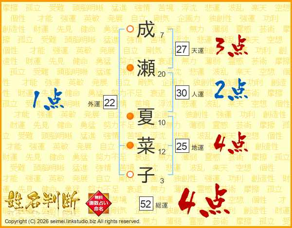 成(7画)瀬(20画) 夏(10画)菜(12画)子(3画)