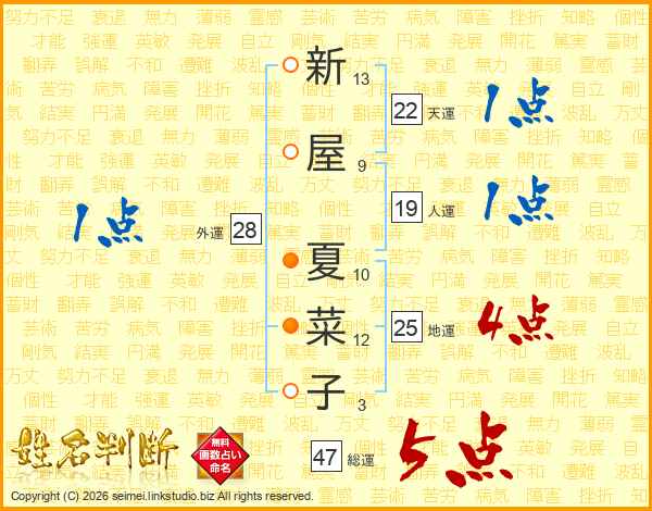 新屋夏菜子さんの総運は47画の5点!