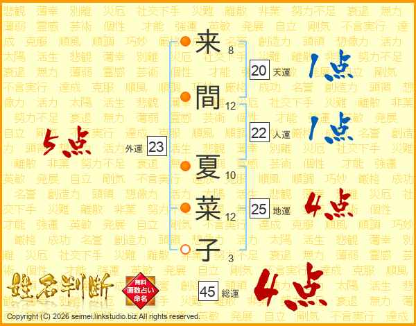 来(8画)間(12画) 夏(10画)菜(12画)子(3画)