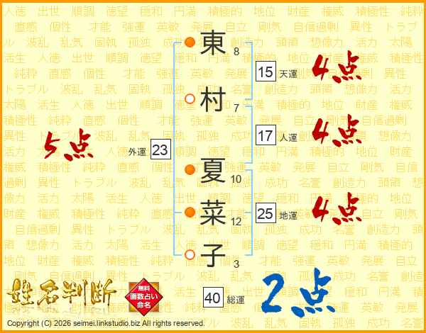 東(8画)村(7画) 夏(10画)菜(12画)子(3画)