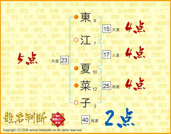 東(8画)江(7画) 夏(10画)菜(12画)子(3画)