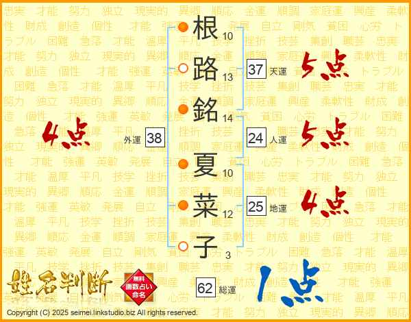 根(10画)路(13画)銘(14画) 夏(10画)菜(12画)子(3画)