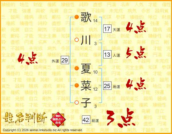 歌川夏菜子さんの天運は17画の4点!