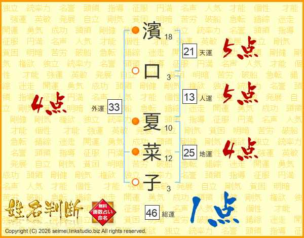 濱(18画)口(3画) 夏(10画)菜(12画)子(3画)