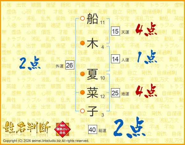 船(11画)木(4画) 夏(10画)菜(12画)子(3画)