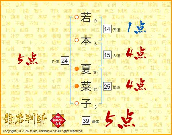 若(9画)本(5画) 夏(10画)菜(12画)子(3画)