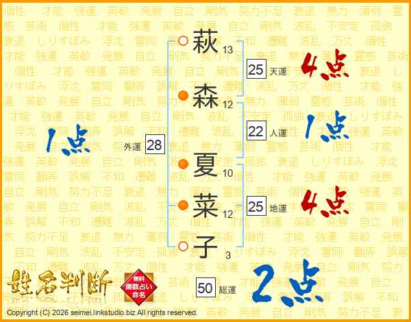 萩(13画)森(12画) 夏(10画)菜(12画)子(3画)