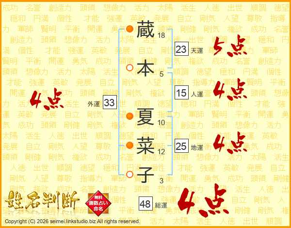 蔵(18画)本(5画) 夏(10画)菜(12画)子(3画)