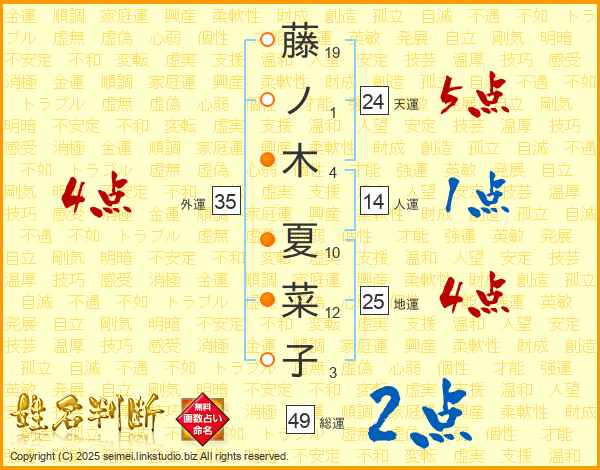 藤(19画)ノ(1画)木(4画) 夏(10画)菜(12画)子(3画)